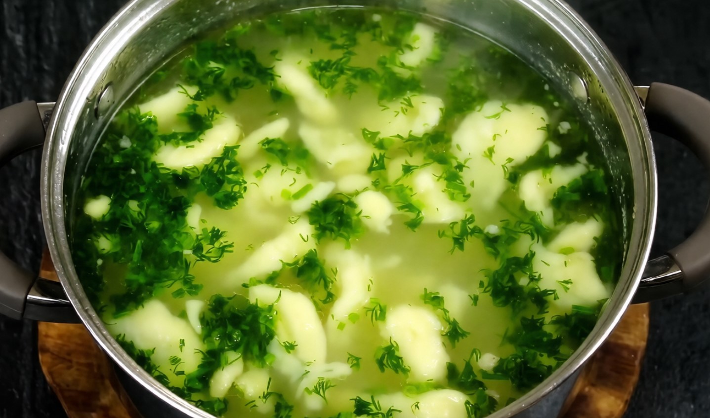 Выкладываем маленькие порции теста в бульон, варим еще 5 минут. Шинкуем укроп и высыпаем в бульон, перемешиваем.