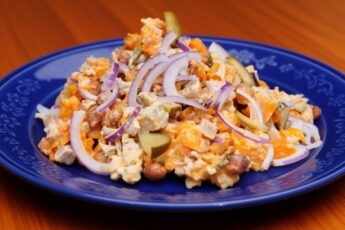 Сыр трем на крупной терке, также трем и колбасу или ветчину. Добавляем к остальным продуктам.