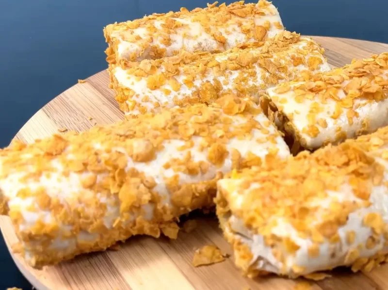 Окунаем рулет в яйцо, а затем обваливаем в хлопьях.