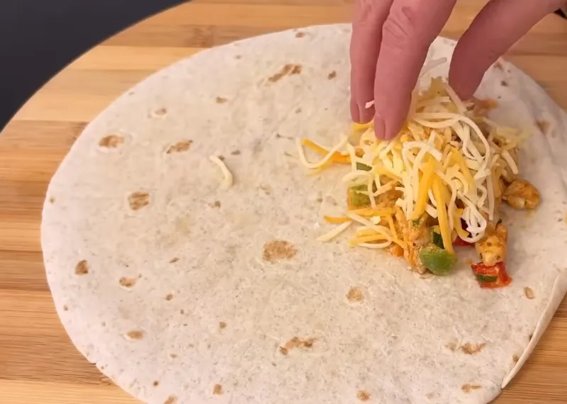 В лаваш выкладываем начинку и посыпаем ее сыром, сворачиваем в конвертик.