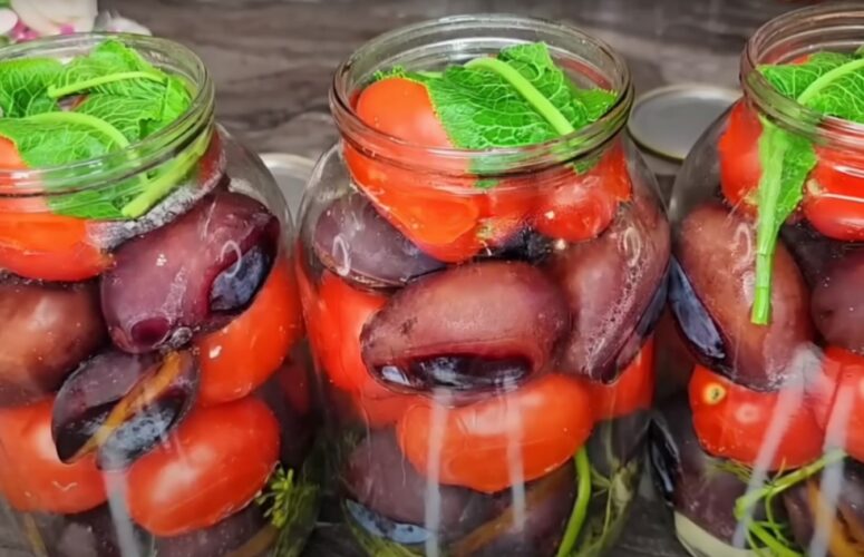Секрет моей свекрови: маринованные помидоры со сливами без варки. Просто залей кипятком и зимой будешь есть счастье ложкой!