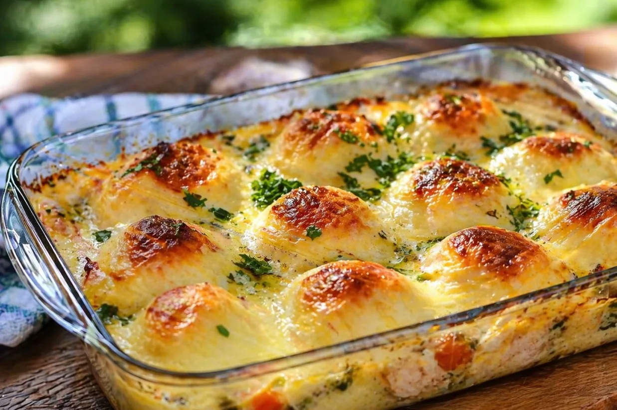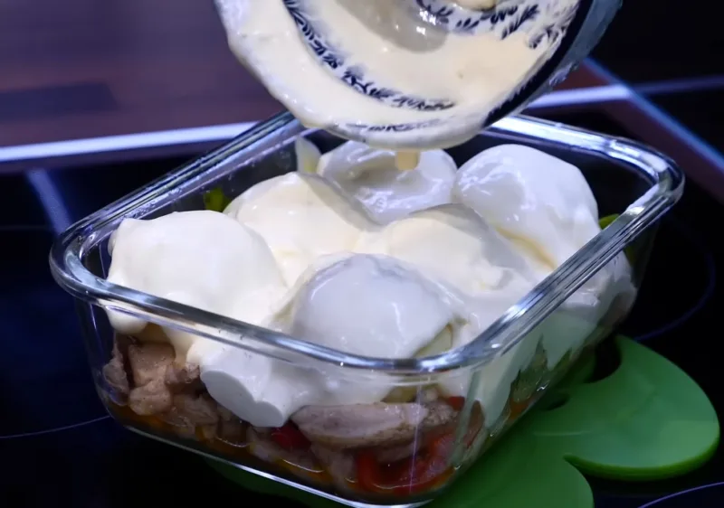 Для соуса смешиваем майонез с яйцом, а затем кладем сливки. Заливаем соусом картофельные шарики, соус должен покрыть картошку.