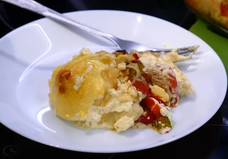 В сковороде на растительном масле пассируем лук и сладкий перец, делаем овощи мягкими, но не зажариваем. Выкладываем пассированные овощи в форму для запекания.