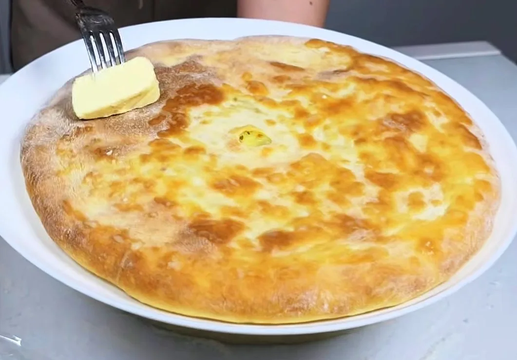 Руками слегка придавливаем пирог, чтобы он был более плоский. Кладем пирог швом вниз и аккуратно пальцами оттягиваем тесто от центра к краям, создавая тонкий пирог.