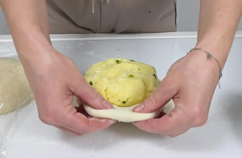 Обминаем колобок, руками формуем лепешку с более толстой серединкой и тонкими краями. Кладем колобок из начинки в лепешку, запечатываем начинку в тесте, будто в мешочке.