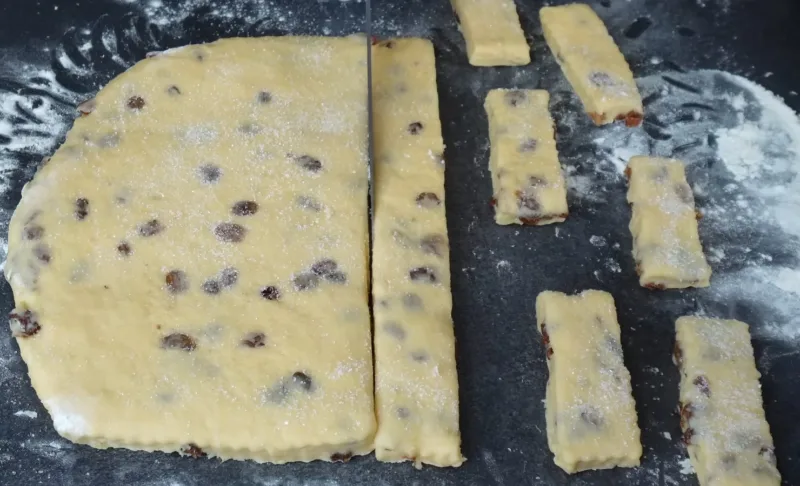 Раскатываем тесто в пласт толщиной около 1 см, делим на небольшие кусочки. Выкладываем кусочки на противень, застеленный пергаментом, и оставляем под целлофаном на 20 минут.