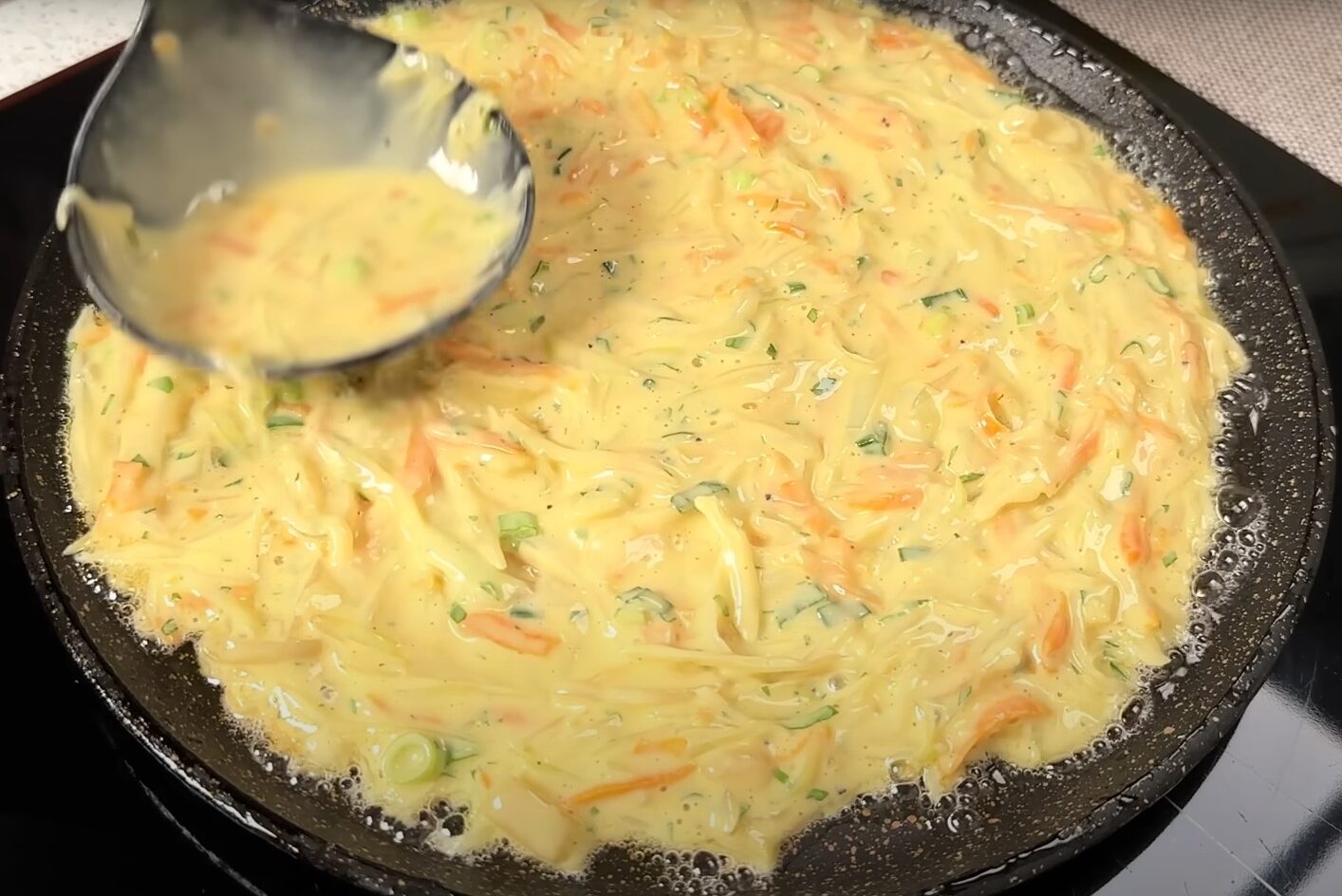 В сковороде разогреваем растительное масло, выкладываем несколько половников теста, выравниваем по поверхности.