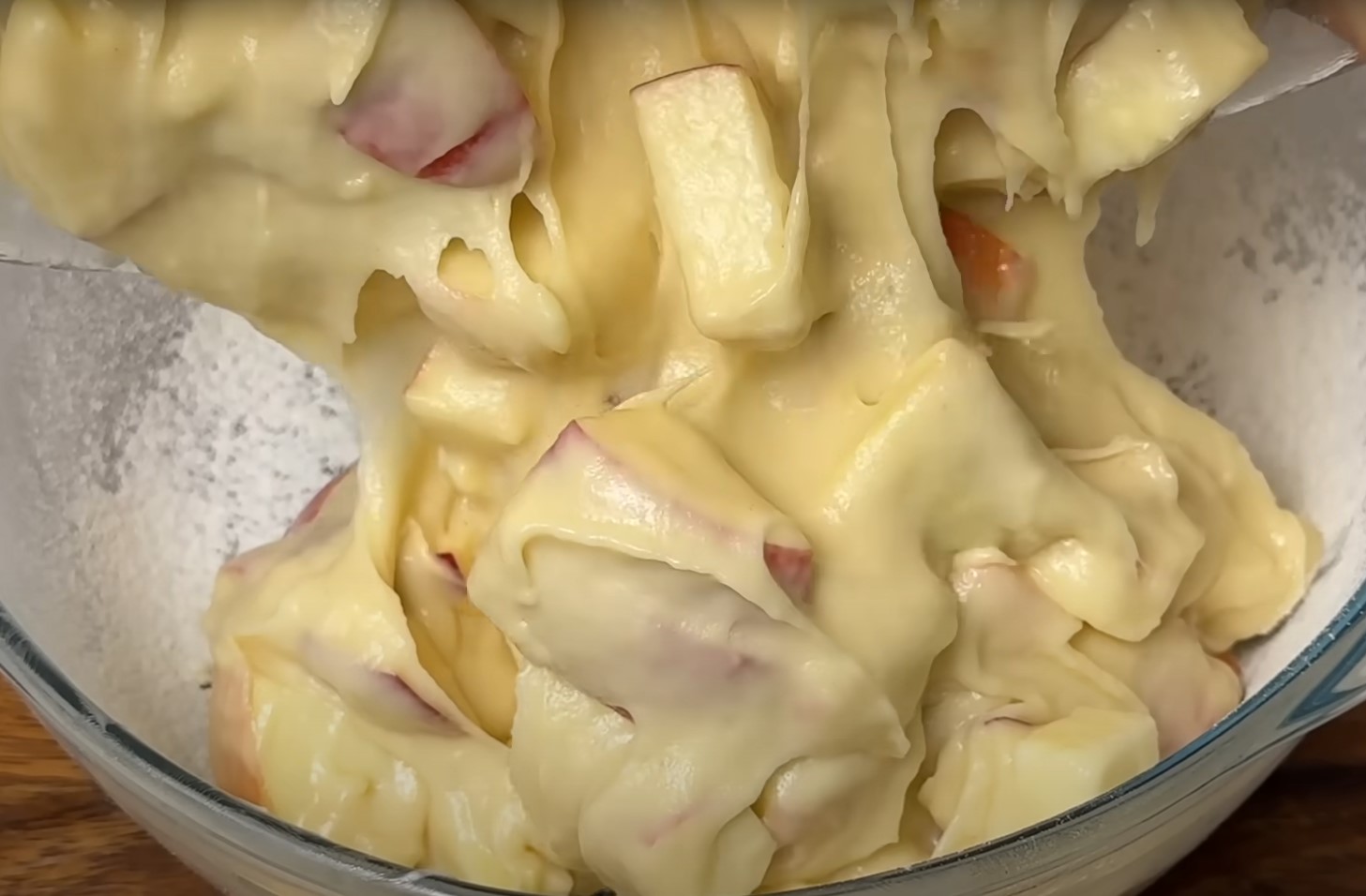 Выкладываем яблоки в тесто, аккуратно перемешиваем. Смазываем форму для выпечки сливочным маслом, посыпаем мукой.