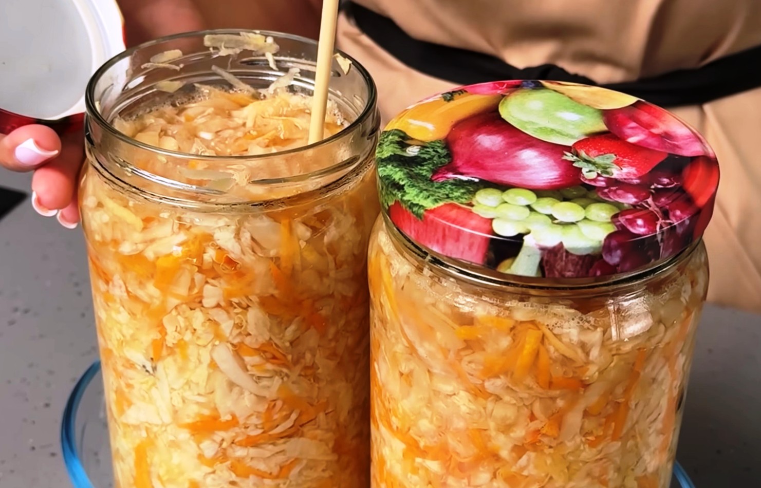 Накрываем банки крышками и оставляем капусту на 3 дня. Каждый день деревянной шпажкой прокалываем капусту, чтобы выходил углекислый газ.