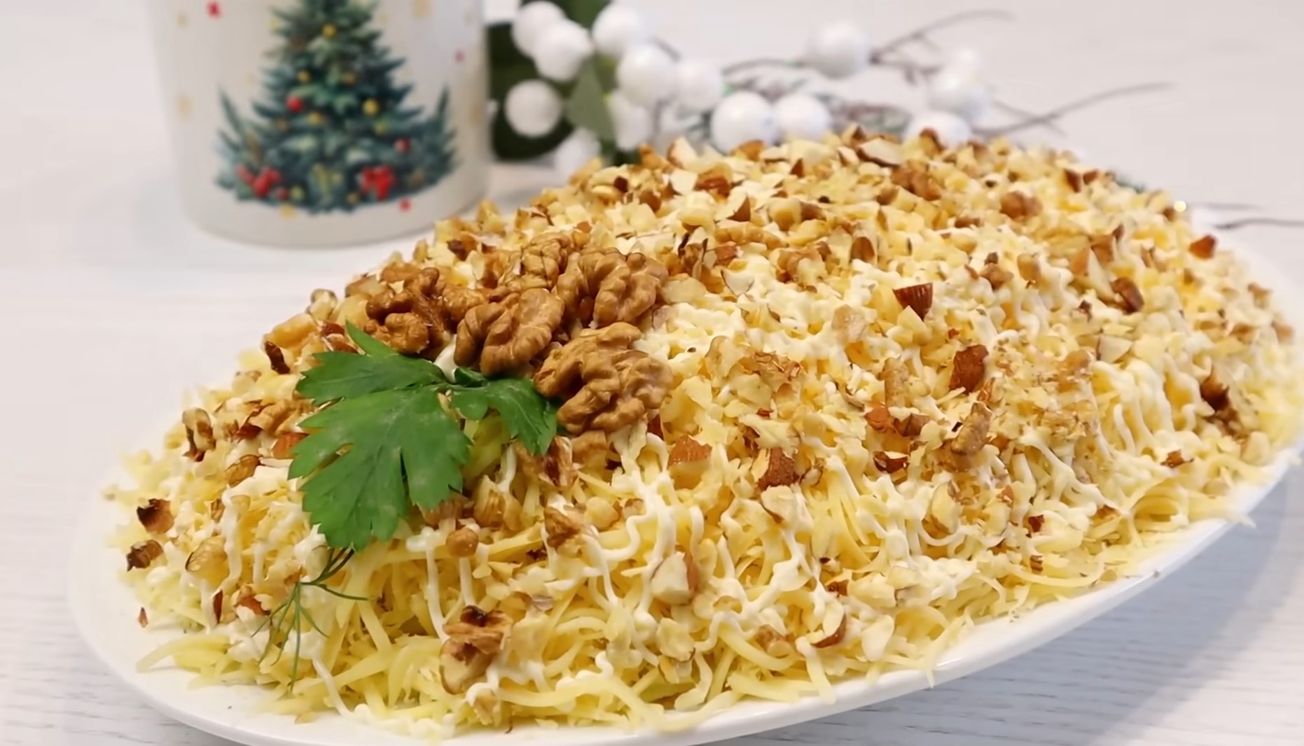 Измельчаем орехи и посыпаем ими сырный слой. Украсить салат можно не дроблеными грецкими орехами и зеленью.