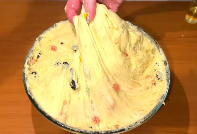 Кладем в тесто мягкое сливочное масло и замешиваем тесто руками 10-15 минут. Сливаем воду с цукатов и изюма, слегка обсушиваем и высыпаем в тесто, перемешиваем.