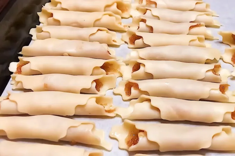Сворачиваем квадратики в рулетики и выкладываем на противень, застеленный пергаментом. Выпекает “Кифлики” при 180 градусах 20 минут.