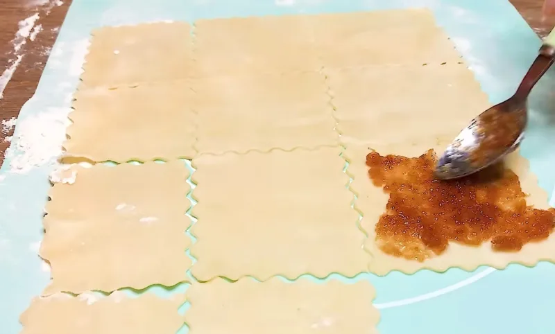 Далее каждую часть раскатываем в тонкий пласт не более 1-2 мм. Делим пласт теста на небольшие квадратики, смазываем каждый квадратик вареньем.