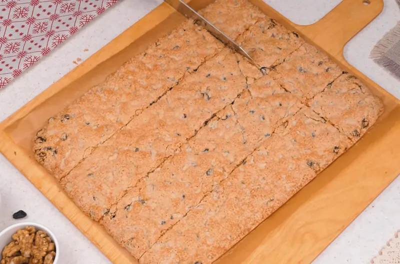 Мои лайфхаки: чтобы изюм в печенье был сочным, а не жестким, залейте его кипятком на 5 минут, а затем обязательно просушите бумажным полотенцем. Орехи же лучше не измельчать в блендере в пыль, а порубить ножом на крупные кусочки — именно эти хрустящие «островки» в сочетании с мягким тестом делают «Мазурку» такой вкусной.