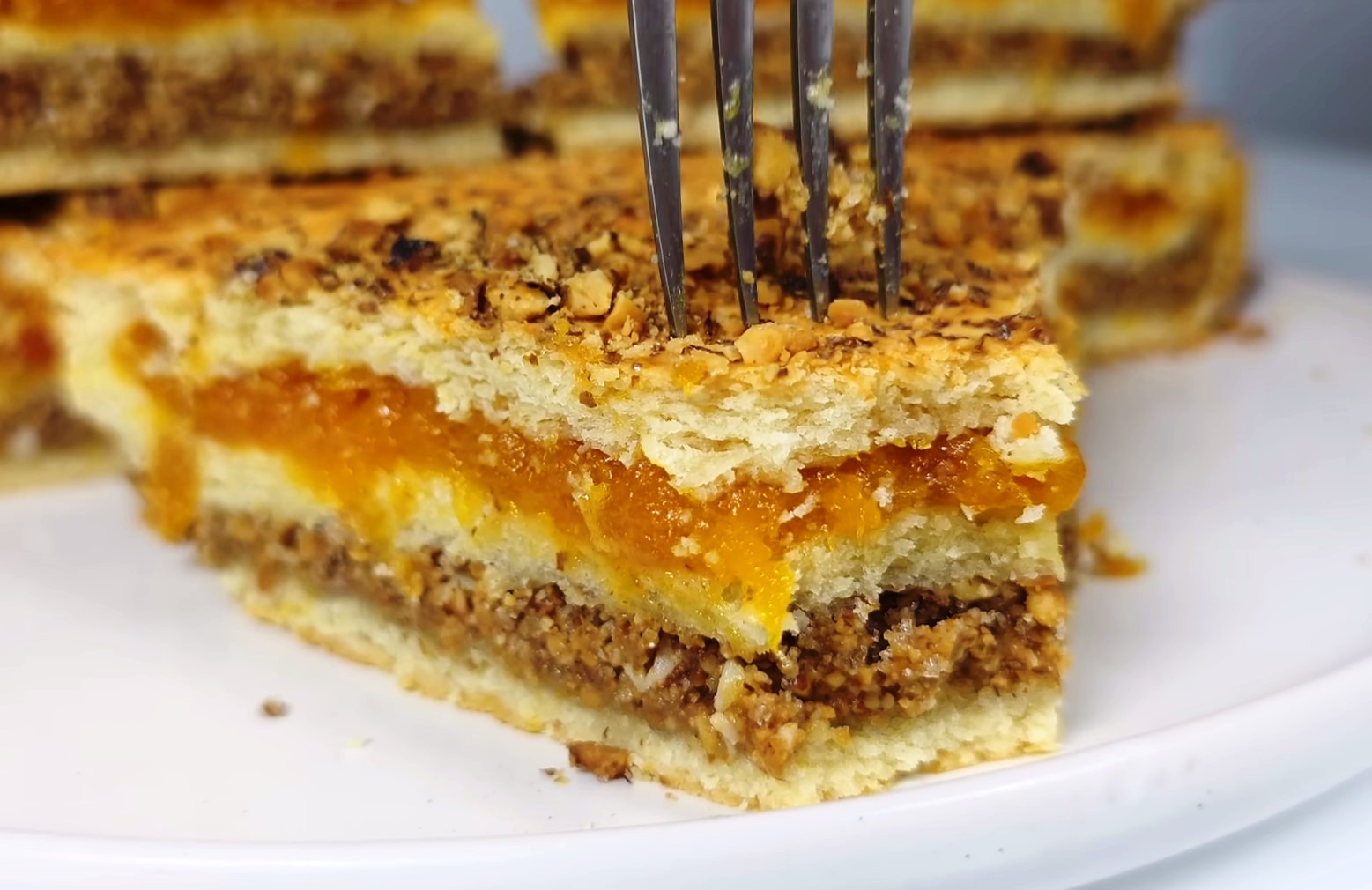 Раскатываем второй колобок по диаметру формы, выкладываем на ореховый слой. На слой теста кладем начинку из кураги, накрываем его последним слоем теста.
