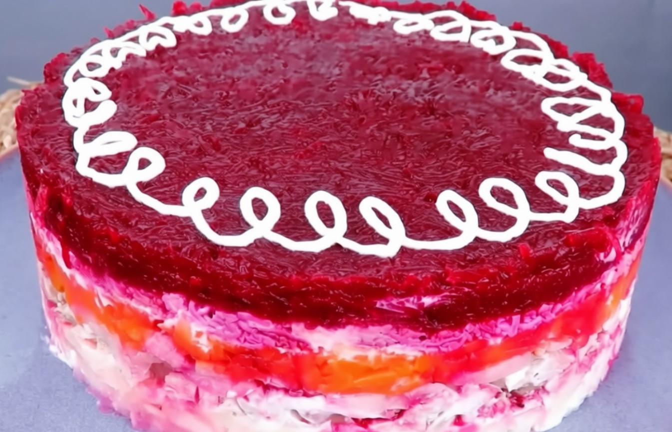 Получается вкусный салат, который похож на “Сельдь под шубой”, но с мясным слоем.