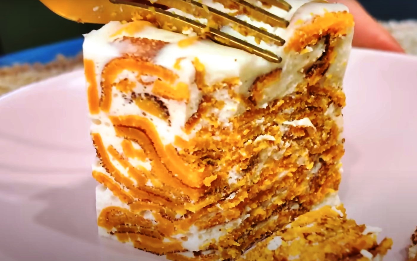 В данном рецепте вместо коржей готовятся тыквенные блины. Вместе с желатиновой основой блины создают вкусный дуэт.
