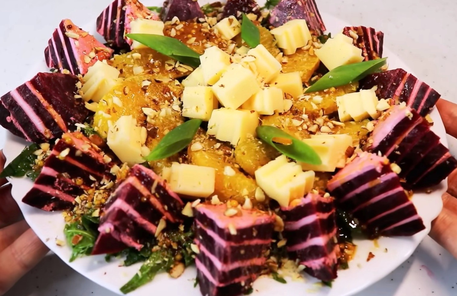 К свекольной сладости можно добавить цитрусовый вкус. Для этого идеально подходит апельсин или мандарин. Сочетание этих продуктов в салате всегда будет выигрышным. Дополнить салат можно свежестью зелени – рукколой и салатными листьями.