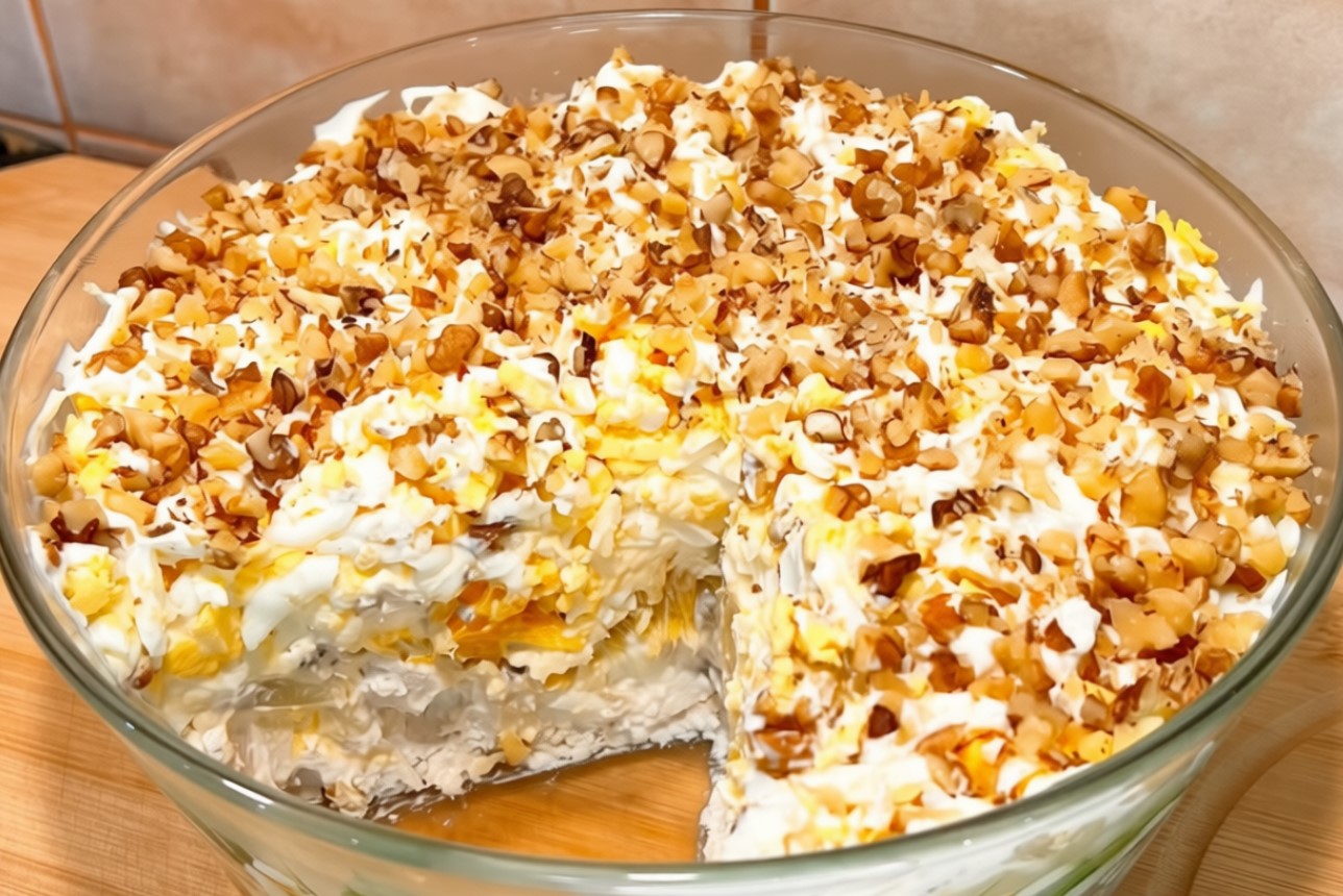 Покрываем яичный слой тонкой сеточкой из майонеза. Для украшения посыпаем салат измельченными орехами и оставляем на 1 час в холодильнике.
