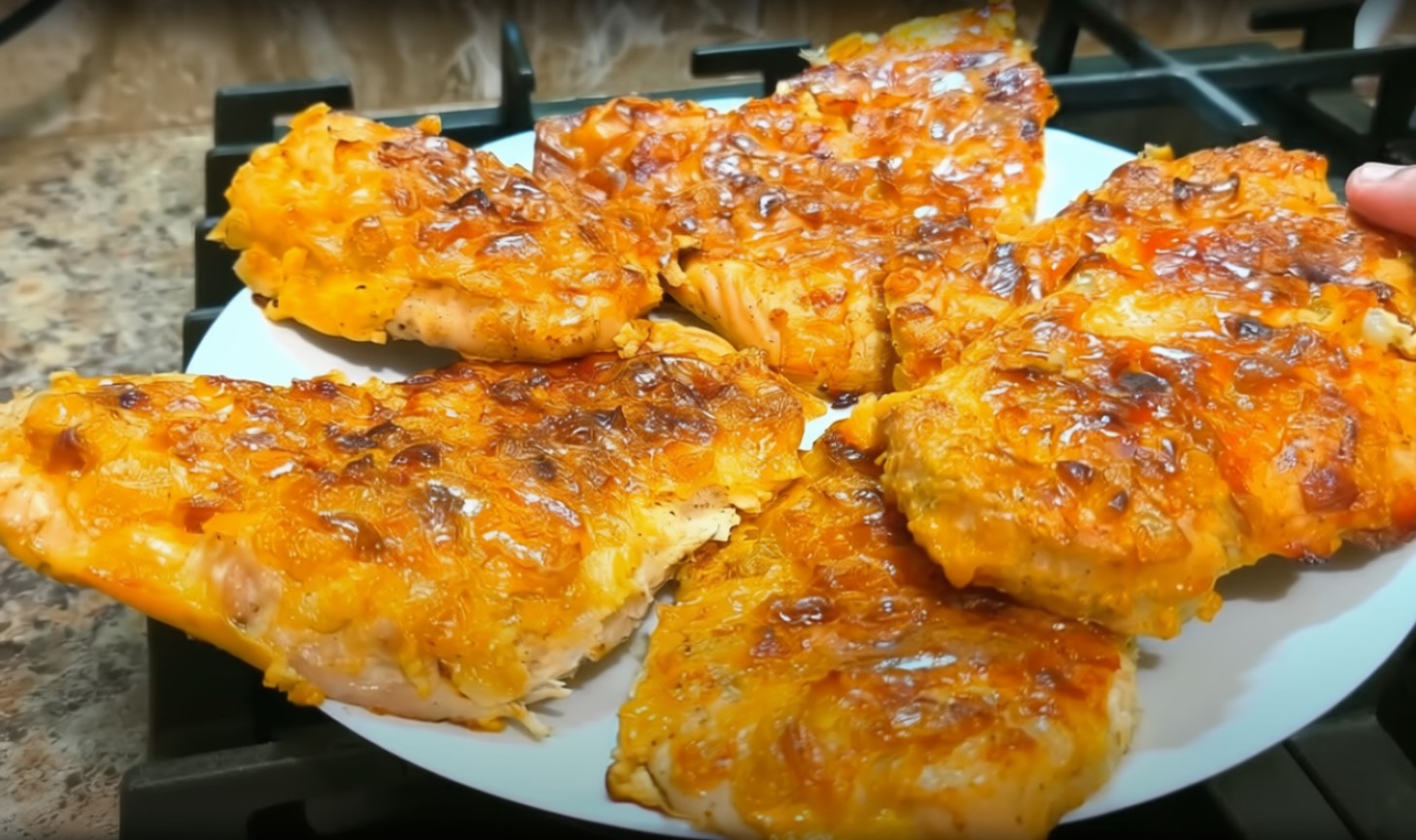 Получается ароматная нежная куриная грудка в луково-яичной заливке.