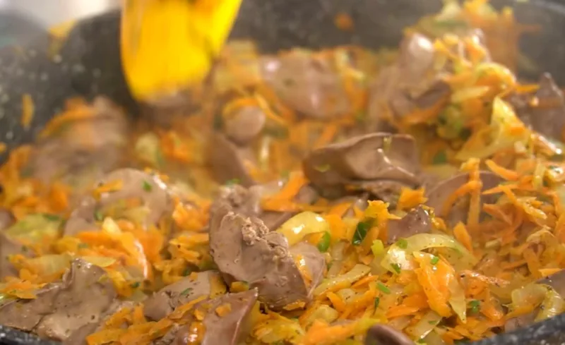 Снимаем пенку с поверхности воды, варим печень еще 3-4 минуты. К моркови и луку добавляем зелень, чеснок и черный молотый перец.