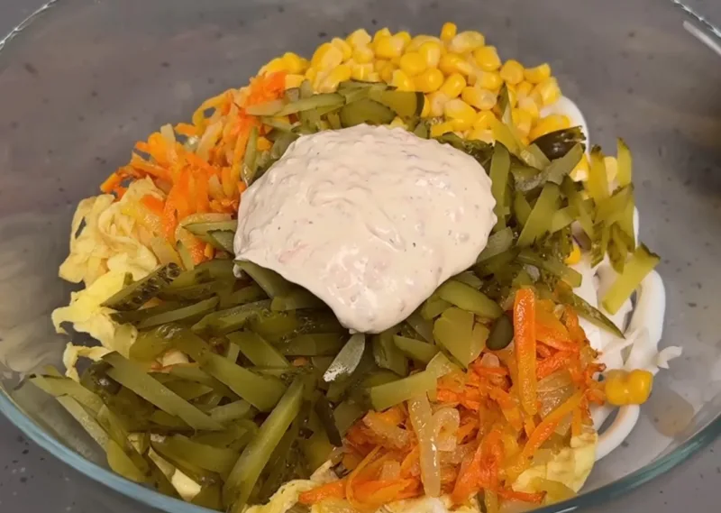 Главное отличие салата с кальмаром в его текстуре. Дело в том, что кальмар после варки остается упругим, при этом нежным. В сочетании с соусом, яйцом, маринованными огурцами и кукурузой этот ингредиент играет новыми красками.