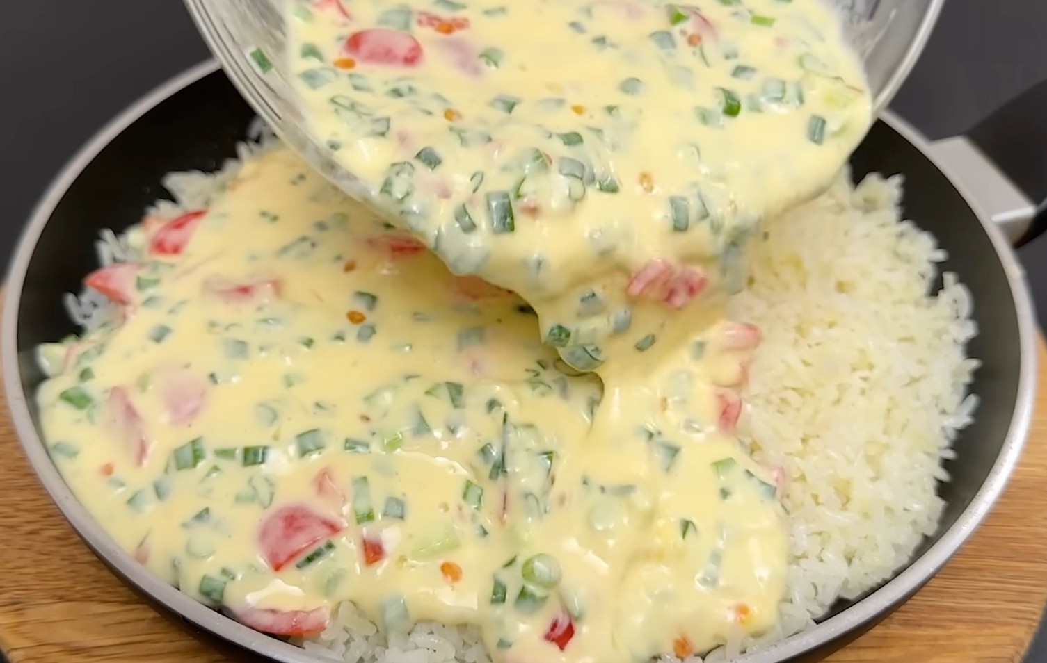 Выкладываем лук и помидоры к яйцам, смешиваем. Рис в сковороде тоже перемешиваем, заливаем яичной смесью.