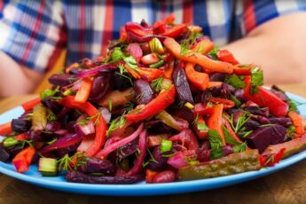 Смешиваем овощи с резаной зеленью, солью, сахаром, приправой для корейской моркови, уксусом и растительным маслом.
