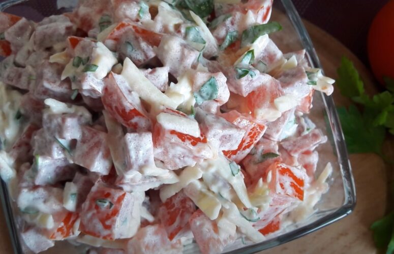 Летом готовлю только его. Салат с помидорами, колбасой и сыром: простой, но такой вкусный