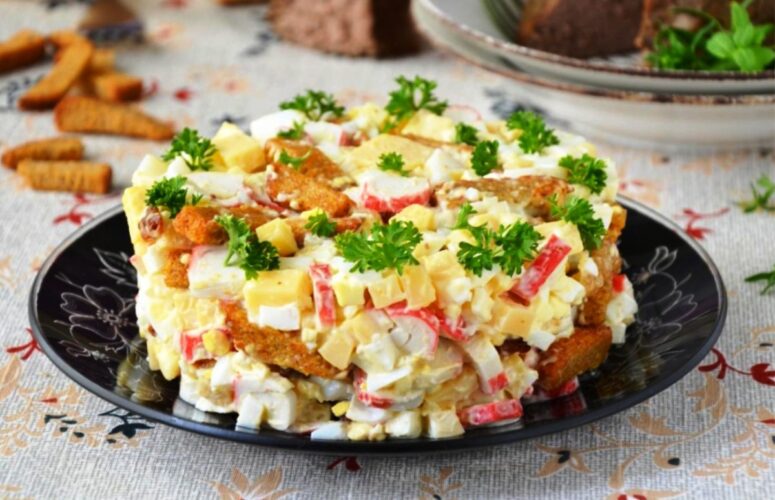 Гости будут довольны. Быстрый и вкусный: салат с сухариками «Королевский»