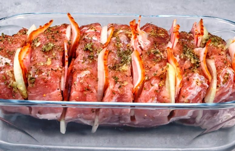 Сочная свинина в духовке. Мясо не пересыхает: делаем надрезы и вставляем бекон с луком