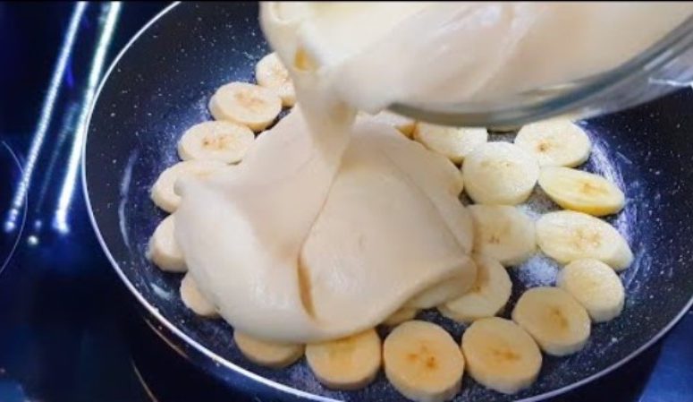Хоть с яблоками, хоть с бананами. На сковороде – мягкий, воздушный пирог – тесто с одним яйцом