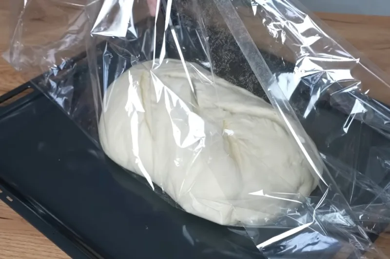Посыпаем шов мукой, чтобы тесто не прилипало к рукаву для запекания. Выкладываем тесто в рукав для запекания. Важно, чтобы рукав был объемным, чтобы в нем образовалось много пара.