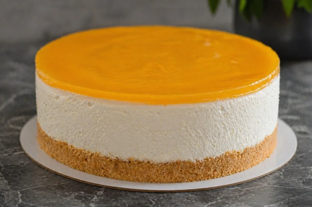 Разогреваем набухший желатин с соком, вливаем к остальному соку и перемешиваем. Заливаем застывший творожный слой чизкейка соком.