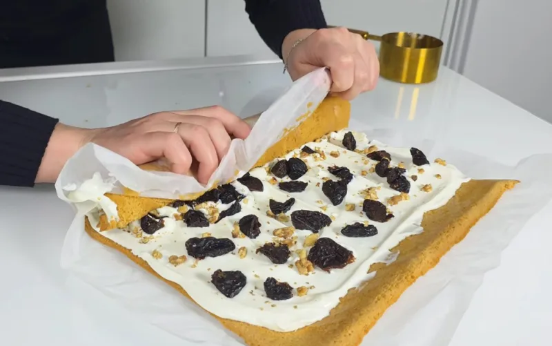 Аккуратно разворачиваем рулет и смазываем его кремом, не доходя до края 2-3 см. Выкладываем на крем чернослив и измельченные орехи, сворачиваем рулет к краю без крема.