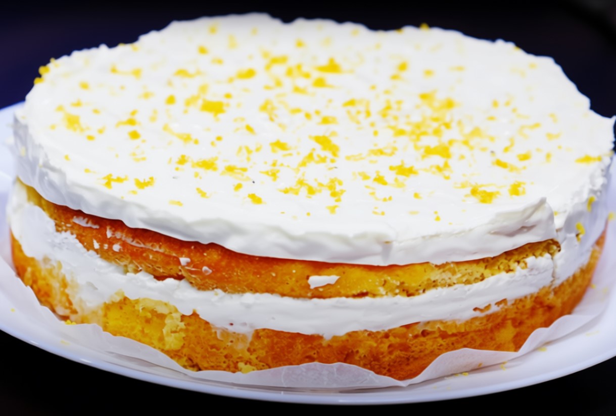 Измельчаем мякоть лимона в блендере. Делим бисквит на два коржа, каждый пропитываем мякотью лимона.