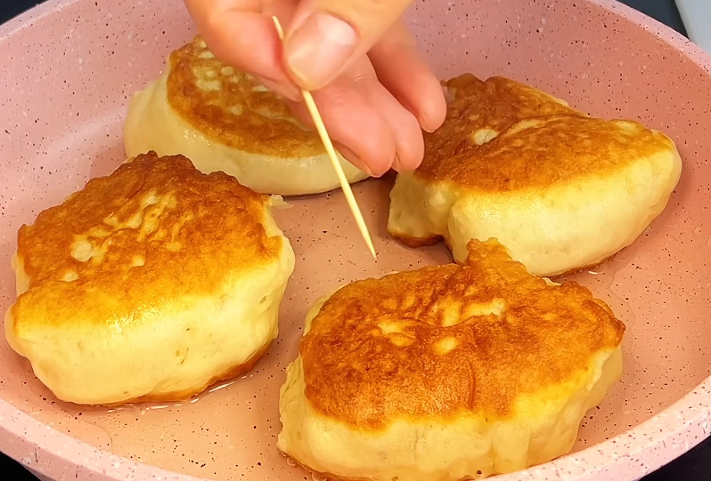 - Кладем оладьи на расстоянии друг от друга, чтобы им было куда расти. Накрываем оладьи крышкой и жарим с каждой стороны по 2-3 минуты на минимальном нагреве.