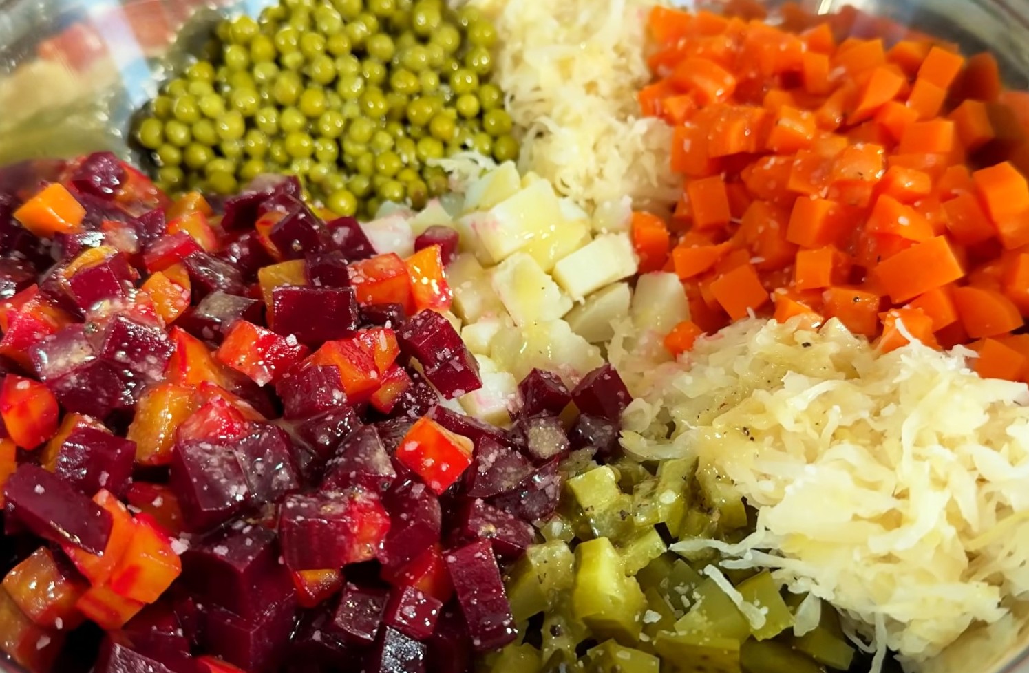 Одним из самых известных салатов в России и странах СНГ считается винегрет. Это простое блюдо из мелко нарезанной свеклы, моркови, картофеля и других овощей с добавлением уксуса, горчицы и растительного масла. Винегрет готовится без мяса, но все равно получается очень вкусным. Его секрет в сочетании продуктов, что делает салат слегка сладким с легкой кислинкой и ненавязчивым овощным вкусом.