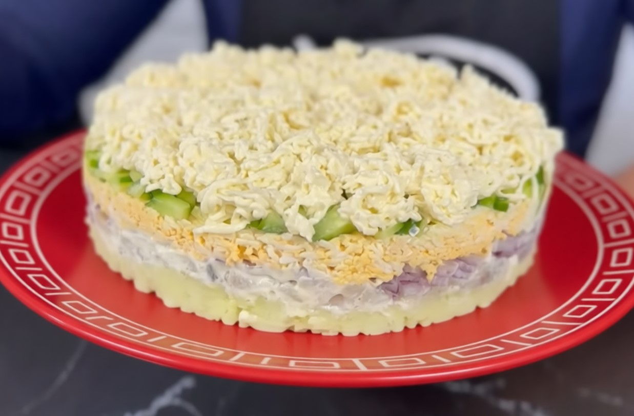 Нарезаем маленьким кубиком сельдь, салатный красный лук и огурцы. Натираем на крупной терке вареный картофель и выкладываем в кулинарное кольцо.
