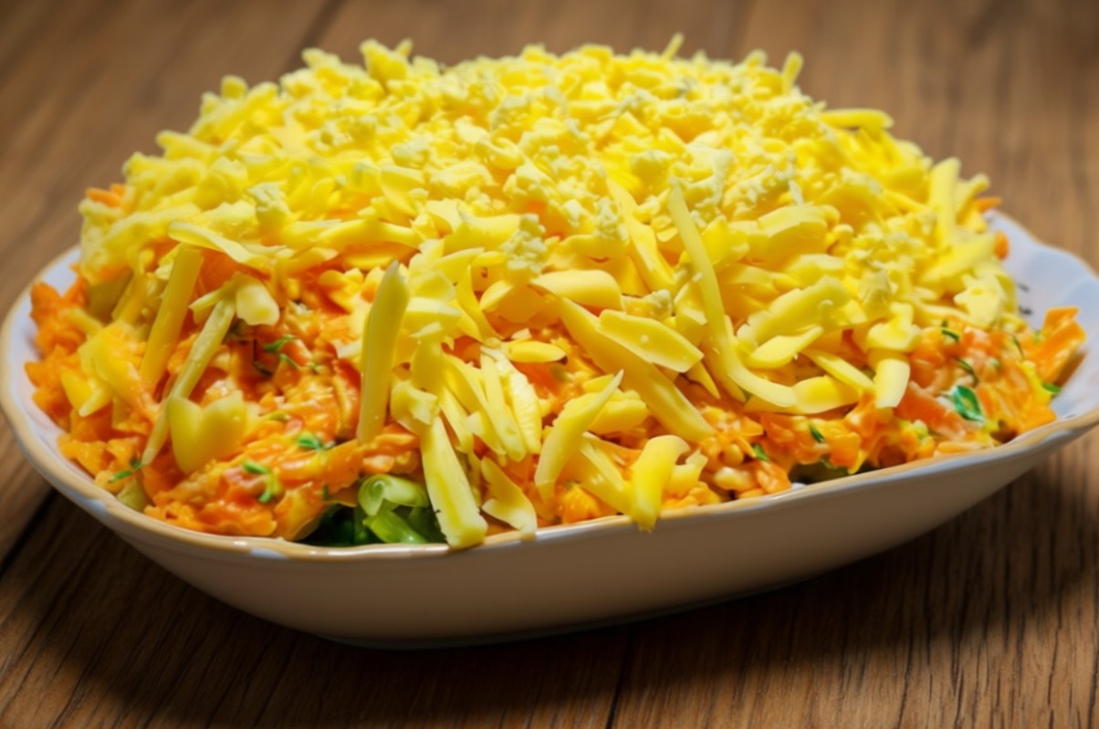Можно по желанию измельчить желток и покрыть им сырный слой. Получается необычный салат для праздника.