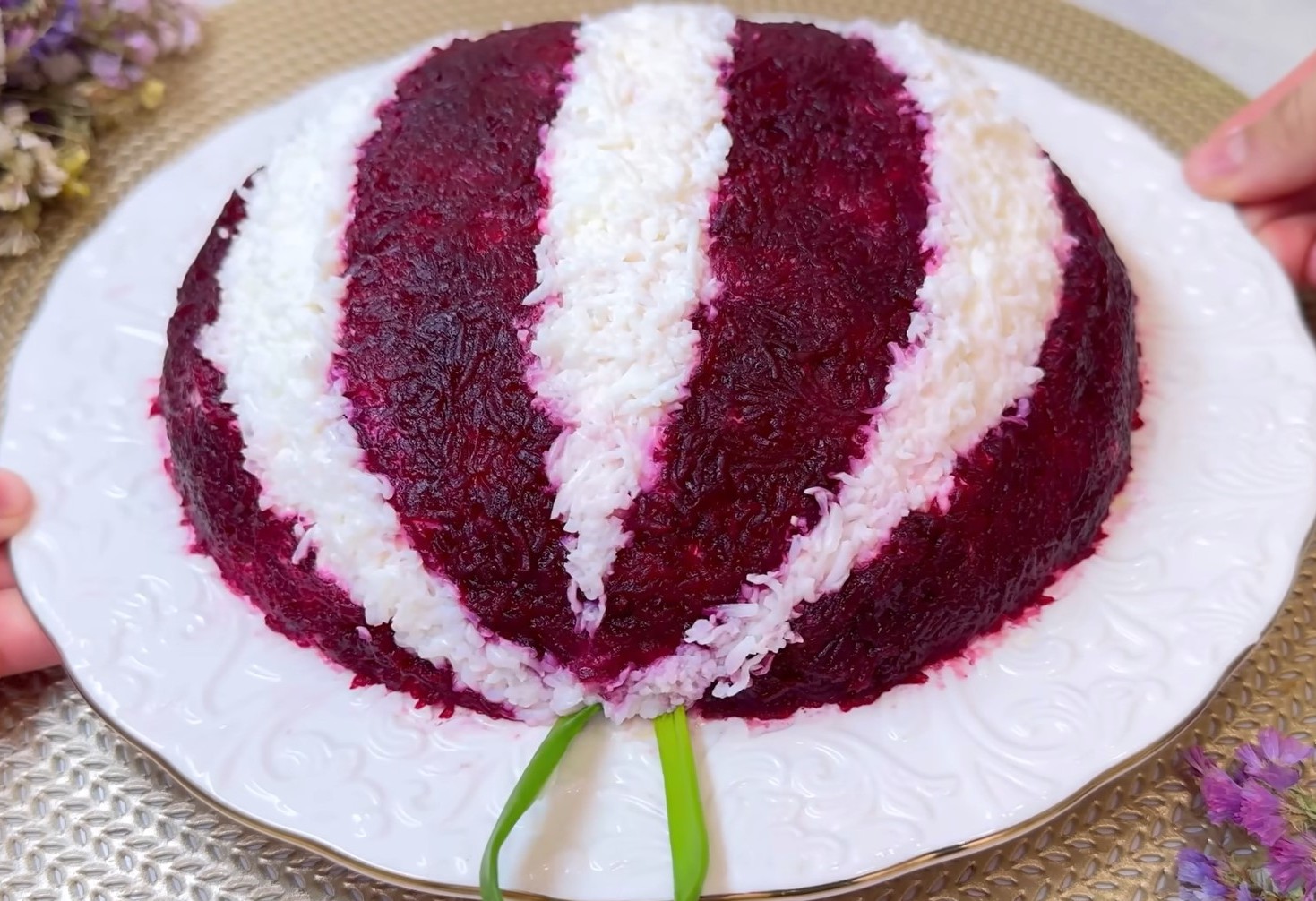 Свеклу тщательно промакиваем бумажным полотенцем. Делаем на полусфере салата борозды. Выкладываем полосками слои свеклы и белка.