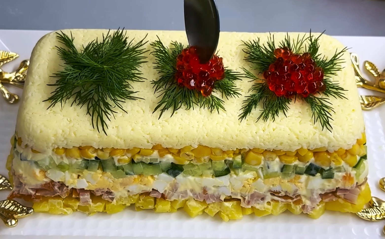 Более сочным и свежим салат становится за счет огурца. В нем содержится много жидкости, которая всегда кстати для слоеного салата. А за сладковатый привкус в блюде отвечает консервированная кукуруза.