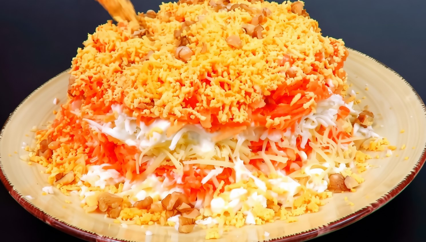 Слои из сыра делают салат нежным и сливочным. Белки придают салату воздушность, делают его более питательным. А слой из смеси сырой моркови и яблока придают особую сочность и легкую сладость.