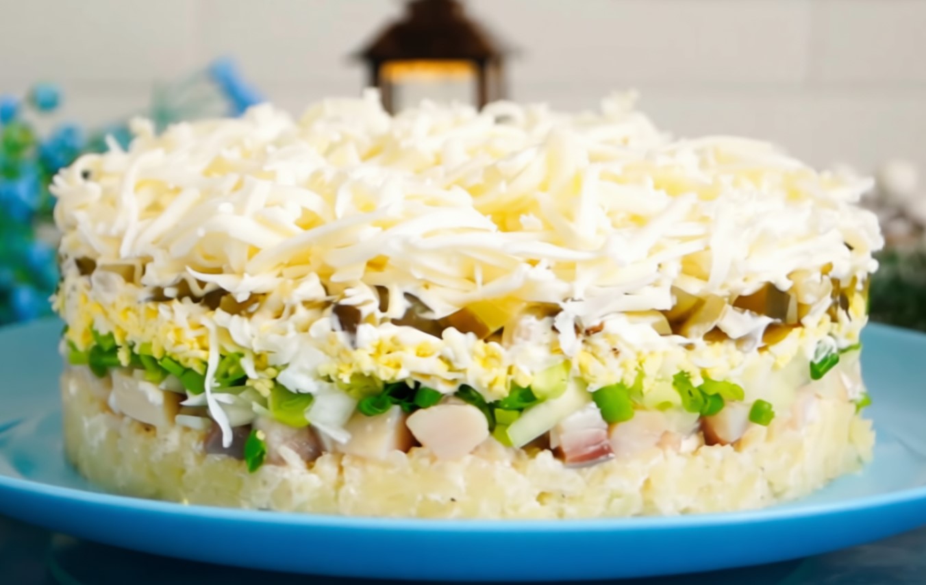Так получается простой слоеный салат, который заменит вам классическую “Селедку под шубой”. Салат готовится из доступных продуктов и не требует настаивания.