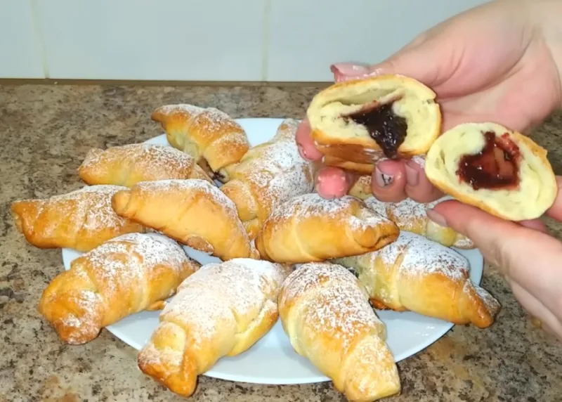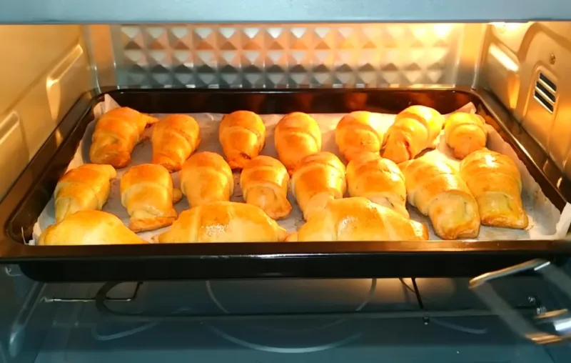 Сворачиваем секции с начинкой в рулетики, получаем небольшие рогалики. Выкладываем рогалики на противень, застеленный пергаментом, и смазываем желтком.