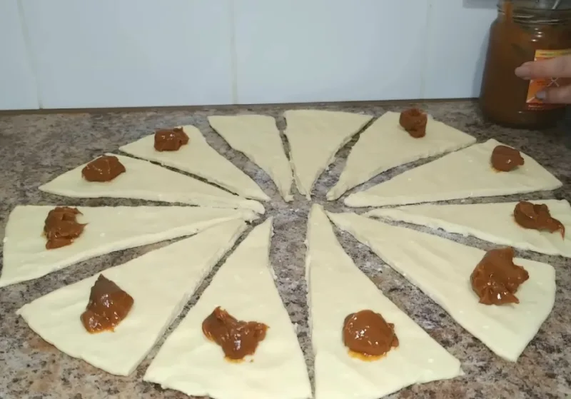 Делим пласт как пиццу на 8 секций или более. На широкую часть каждой секции кладем начинку: джем, вареную сгущенку, повидло.