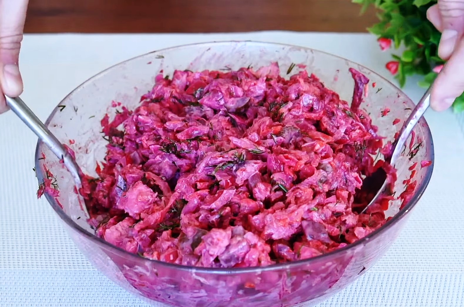 Как правило, такие салаты готовят с добавлением лука и моркови. Эти овощи придают свекле особый вкус, делают салат более гармоничным.