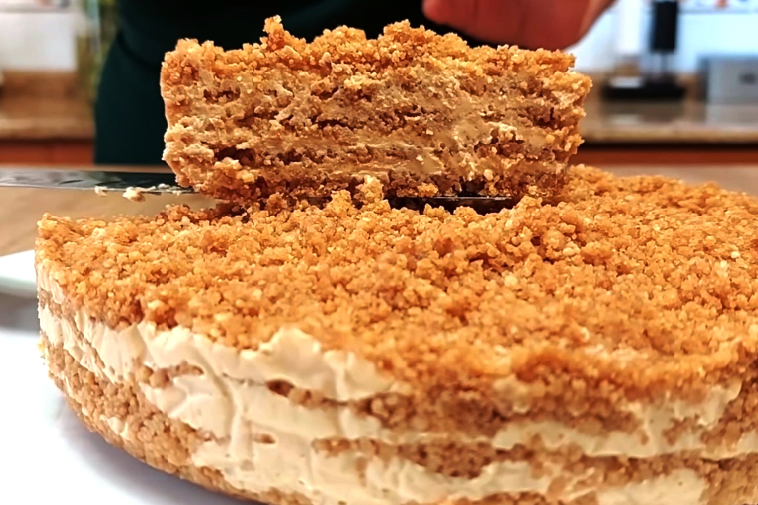 Повторяем слои, пока не закончится крошка. Оставляем торт под пищевой пленкой на 6 часов в холодильнике. Получается простой и довольно быстрый в приготовлении торт.
