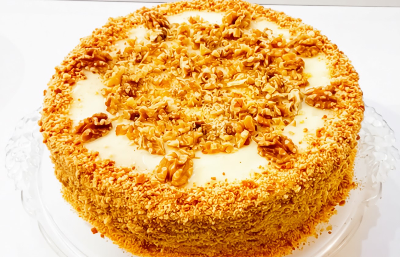 Оставляем торт пропитаться на пару часов при комнатной температуре, украшаем грецким орехом по желанию.