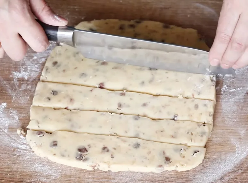 Перемешиваем орехи и изюм в тесте, высыпаем остатки муки. Убираем тесто в холодильник на 20 минут в целлофане.